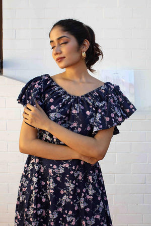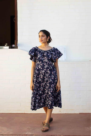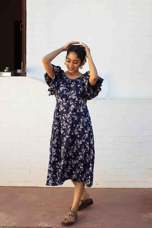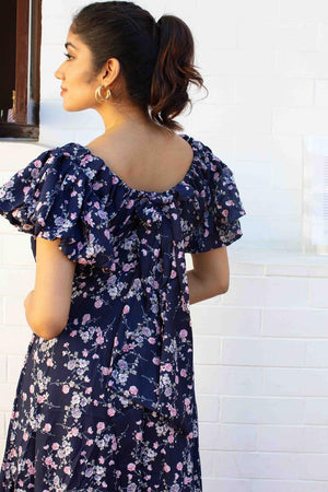 Embrace timeless beauty in this Navy blue floral midi dress, adorned with a graceful back bow detail. Its soft lining ensures comfort, allowing you to move with ease throughout the day. Effortlessly chic, this dress exudes elegance and charm for any occasion.