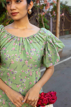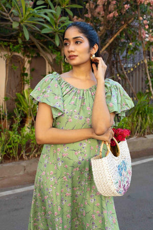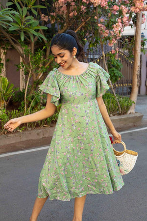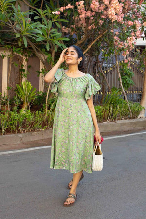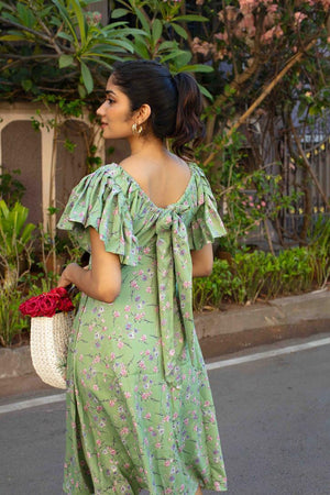 Embrace timeless beauty in this olive green floral midi dress, adorned with a graceful back bow detail. Its soft lining ensures comfort, allowing you to move with ease throughout the day. Effortlessly chic, this dress exudes elegance and charm for any occasion.